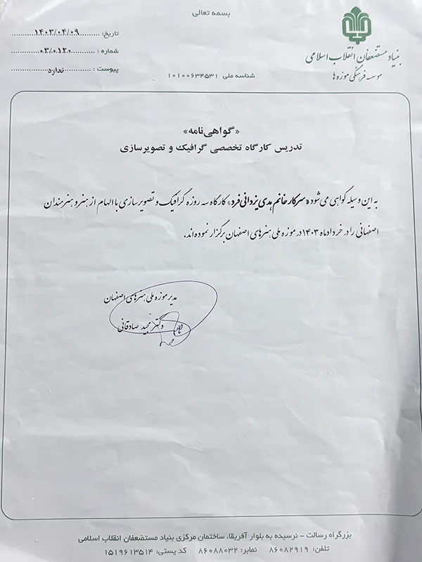 • Summer 2024 (Khordad 1403) – Character Design Workshop based on the art and works of great artists of Isfahan, National Museum of Arts of Isfahan